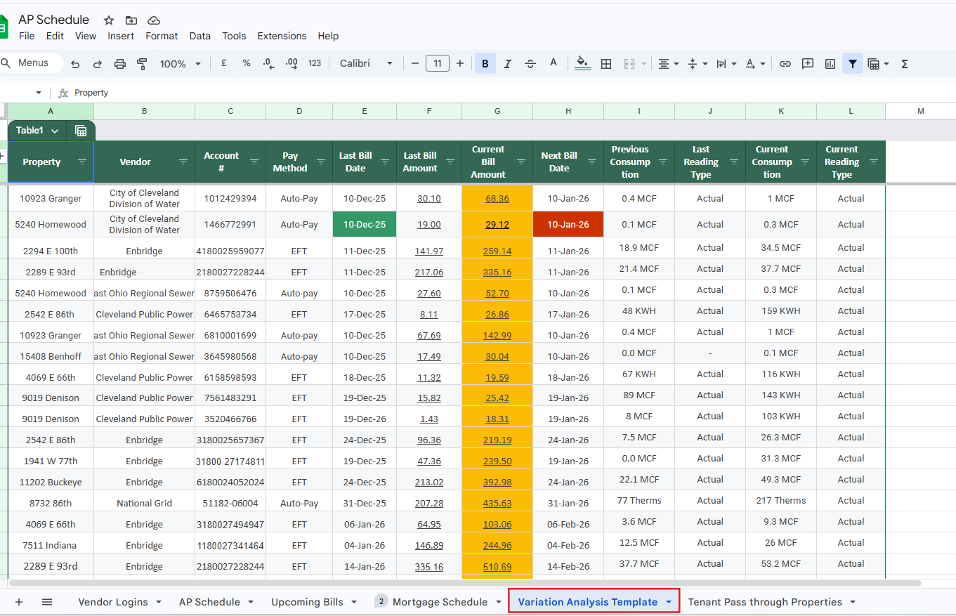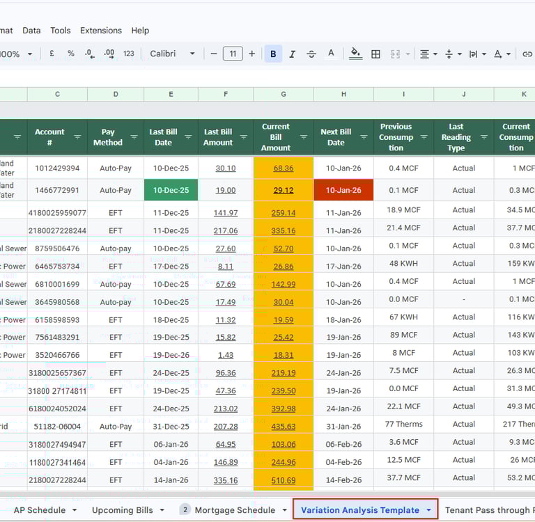 We already have a very sophisticated AP Schedule for each of our clients which is an aggregate visual list of all the Utility accounts in a single space. Beside the last bill amount column, I added a new column known as the current bill amount “Column K” which will place the bill amount of the most recent bill beside the bill for the previous period. Column K is conditionally formatted to light up in case the current bill is higher by 50% or more than the previous regardless of the reason.